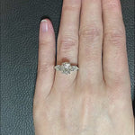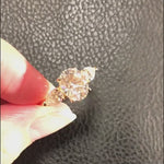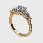 A 2 carat equivalent size oval shape moissanite accented by a pear shape moissanite on each side in prong trellis settings finished with an intricate cable band.