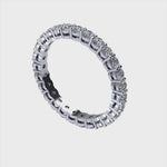 An infinite ring of round brilliant cut diamonds, stunningly displayed in a shared prong setting with low-profile, rounded baskets to allow illumination and shimmer. A diamond eternity ring as timeless as your love.