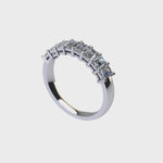 With avant-garde style, this exquisite eight stone diamond wedding ring features emerald cut diamonds in a basket setting that allows the maximum amount of the diamonds’ surface to show and shimmer from any angle.