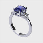 A rich sapphire, the colour of the ocean, set in lustrous double prongs and accented with a baguette diamond and a round cut diamond on each side for a mesmerizing look that will draw every eye in the room.