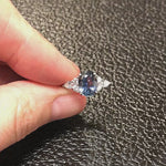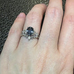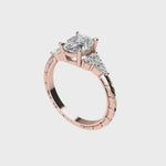 An oval shape moissanite accented by a pair of natural round brilliant cut diamonds and a 0.10 carat pear shape natural diamond on each side with an eye-catching engraved texture band.